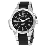 Stainless steel case with a stainless steel bracelet with a black rubber center. Fixed bezel. Black dial with silver-tone hands and Arabic numeral markers displaying: 12 hours, 24 hours and minutes in concentric circles. The D&G logo appears center dial. Quartz movement. Scratch resistant mineral crystal. Solid case back. Case diameter: 44 mm. Case thickness: 11 mm. Water resistant at 50 meters/ 165 feet. Functions: hours, minutes, seconds.